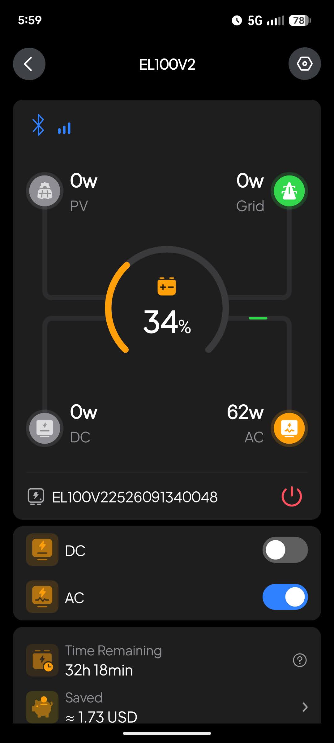 So @BLUETTI_CARE, just log my estimated time remaining issue next to VSM’s and smiller’s if you can. I’ve been using the Time Control UPS feature every day since I got the 100v2 to power some networking equipment when my electricity price is high and recharge from the grid when the price is low, and the power station lasts about 17 hours rather than the 95 hours that is shown below. If I do the simple calculation of 1024Wh * 0.95 battery capacity remaining / 55w power draw, that results in 17.6 hours, and this very basic calculation is a much better estimate than the 95 hours the 100v2 is showing. Same for my screenshot from last night (shown above) when 34% was remaining, doing the same 1024 * 0.34 / 62 = 5.6 hours rather than the 32 hours the 100v2 was showing. I know this simple formula doesn’t account for a lot of stuff but it’s still far, far more accurate than what the 100v2 displays.