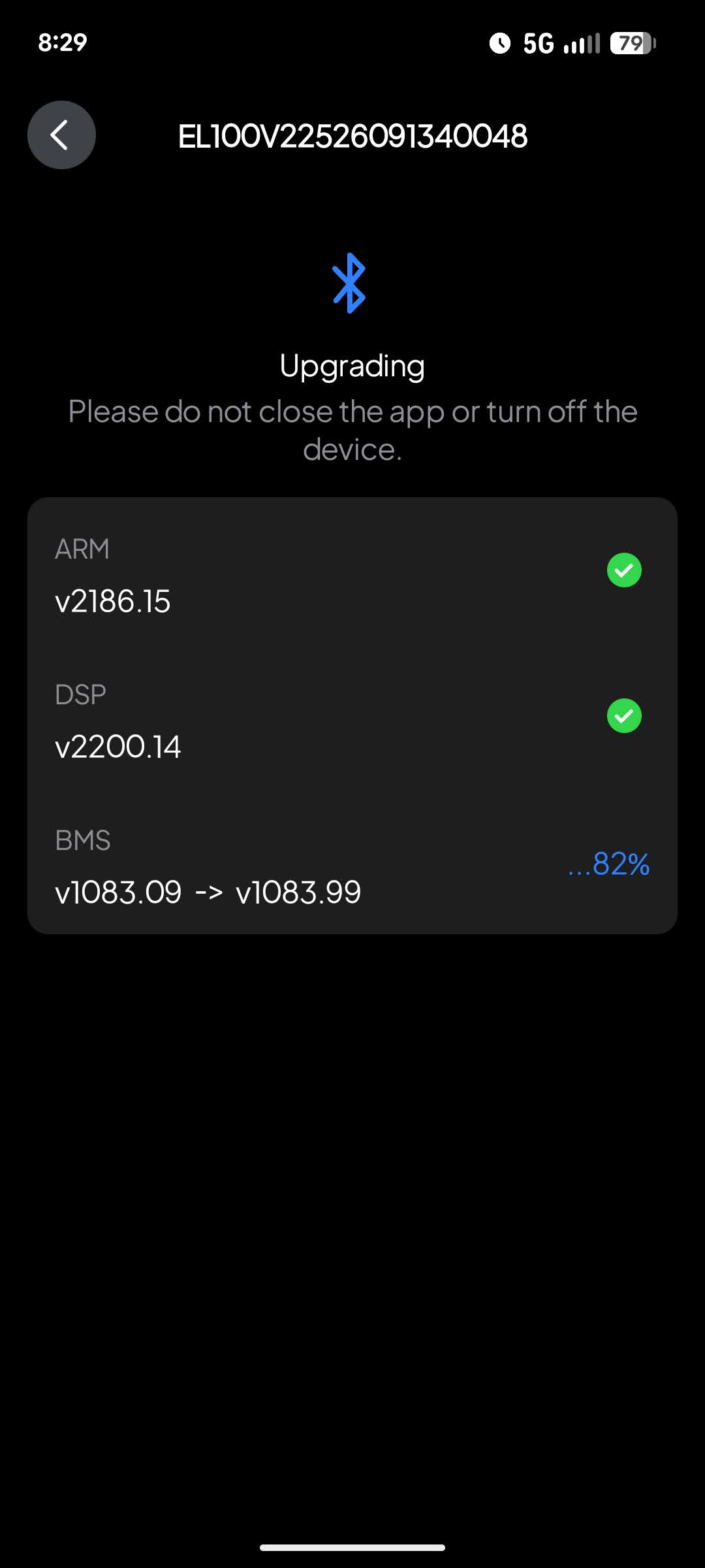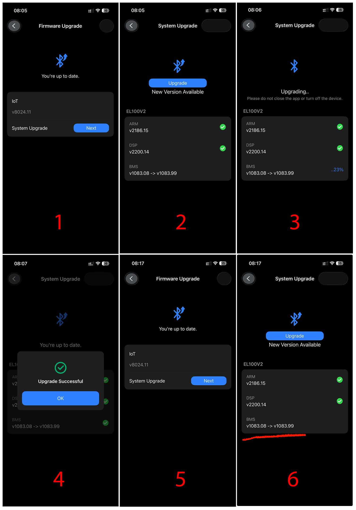 Hi @dparson55 @BLUETTI_CARE ! Thanks for advice. But I connected to the device via Bluetooth (following the instructions from the posts above). The system reports that the update is successful (to 1083.99). And when I try to check the current firmware version after the update, I see the old version number. And the original problem with the remaining time and power consumption still exists. In the attached image, I tried to show all my steps to update the firmware. After the 4th image, I try to check the installed version. I see that 1083.99 was not installed and the system suggests me to update the firmware to 1083.99 again (image 6).