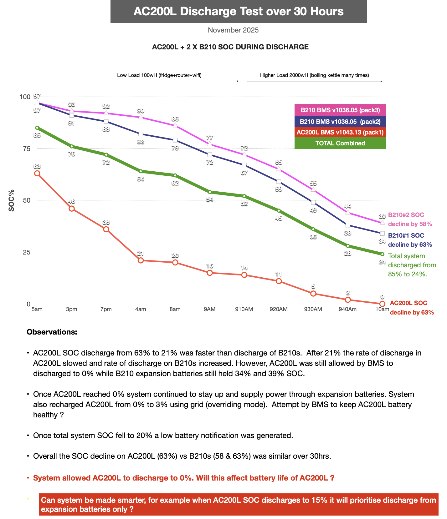 Also, for clarification I ran a 30hr discharge test and graphed the result. Can you please confirm the future BMS upgrade will prevent AC200L discharge to 0% when B210 expansion batteries are still holding >30% SOC.
