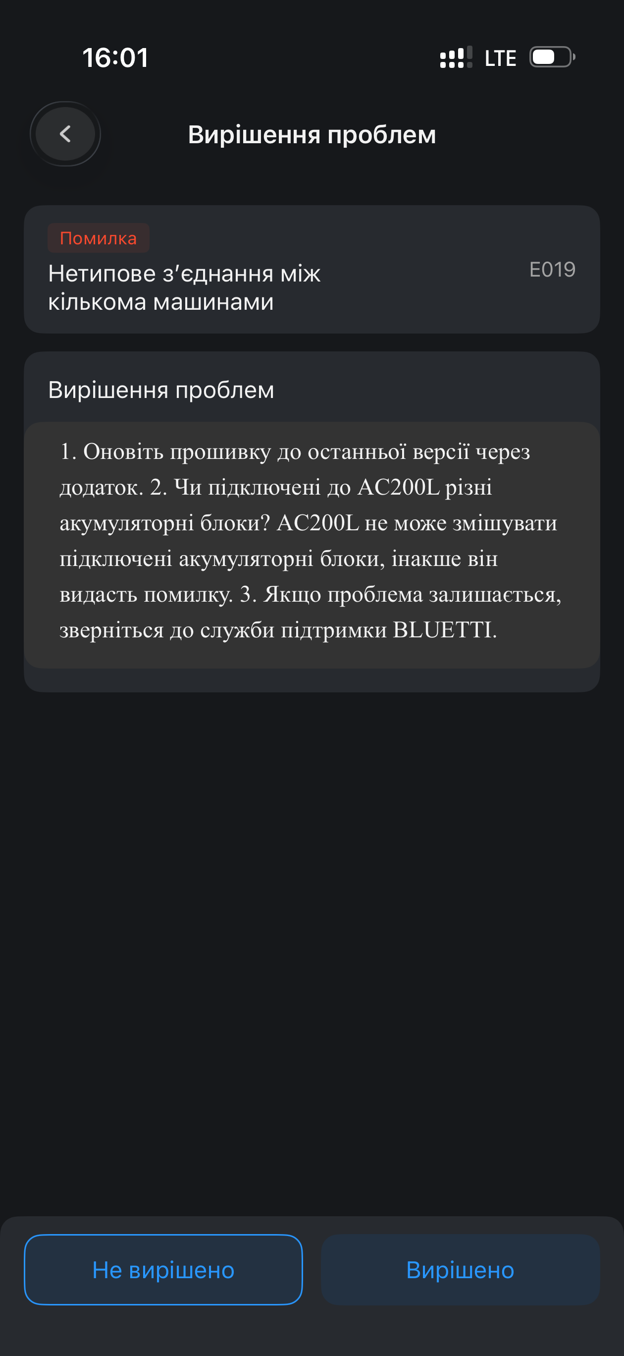 AC200L + B300 + B500K (chained via two P090A cables): does not work. AC200L shows error E019 on the screen and in the app, the B500K has an empty Model field (“–”), and firmware update fails with “The device code is empty.”