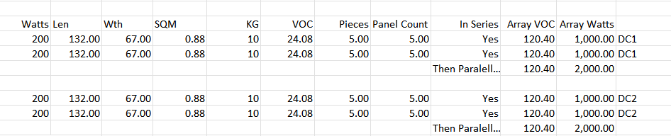 That would work fine. You have enough buffer to cover for voltage spiking slightly due to temperature coefficient of panels in cold weather. For example at 0F/-17C your 24V panel would produce 27V assuming the standard loss of -0.30% per degree C below 25C. This puts you at around 135V for the array which is below the 150 you are maxed out at. The only drawback is your MPPT controller only supports a max of 12A per DC input, so while you are pushing 16A through, it will reject the remaining 4A, so the array on DC1 would be 120.4X12 or 1440W, not 2000. While that’s not ideal, you would benefit from shading/cloudy days thanks to overpaneling. On a sunny day, yes each 200W panel would produce 8A but that current drops to 25% on mostly cloudy and around 10-12.5% on extremely overcast days. What is 12.5% of 8A? Just 1. This means you will have 120W per string roughly or 240W for DC1 and 240W for DC2 for a total of 480W in the worst case cloudy scenario. Double 12.5% is 25% so if clouds shade to 25% it would be 960W total (120V/8A) and since you can only get 12A you are maxed out to just 1440W or 72% of your array potential maximum. The max input per channel is 100V@12A or 1200W so while your solar panels CAN produce 1440W each channel is limited to and will be throttled to 1200W. MPPT will just reject the rest. So 1200W max on DC1 and 1200W max on DC2.