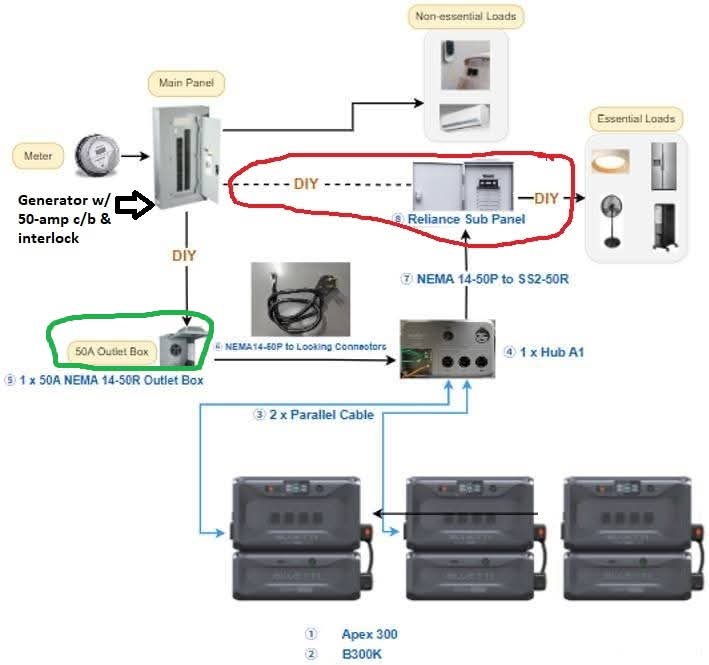 I’m US based so the info I have is based on this. 1st in order to obtain 50-amp, I need 3 Apex300’s (each is approx. 16-amps). This is the general wiring diagram that includes a transfer switch. No special cables required for the Bluetti connections. (hopefully picture posts)
