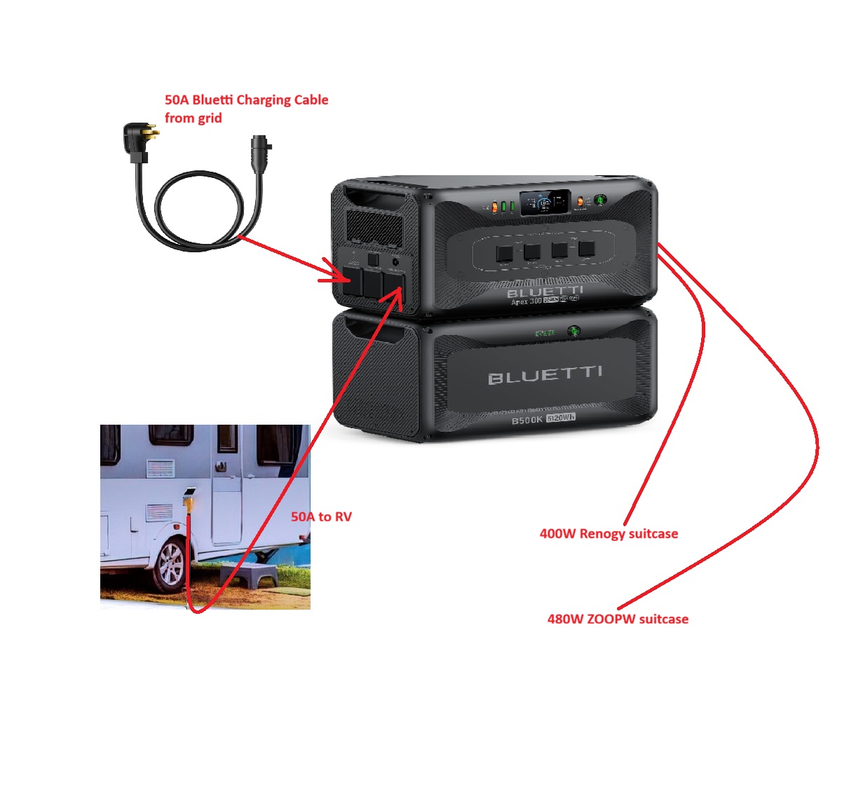 I’ve attached a picture showing how I plan to connect everything (shore power to Apex, Apex to RV, plus two portable solar suitcases).