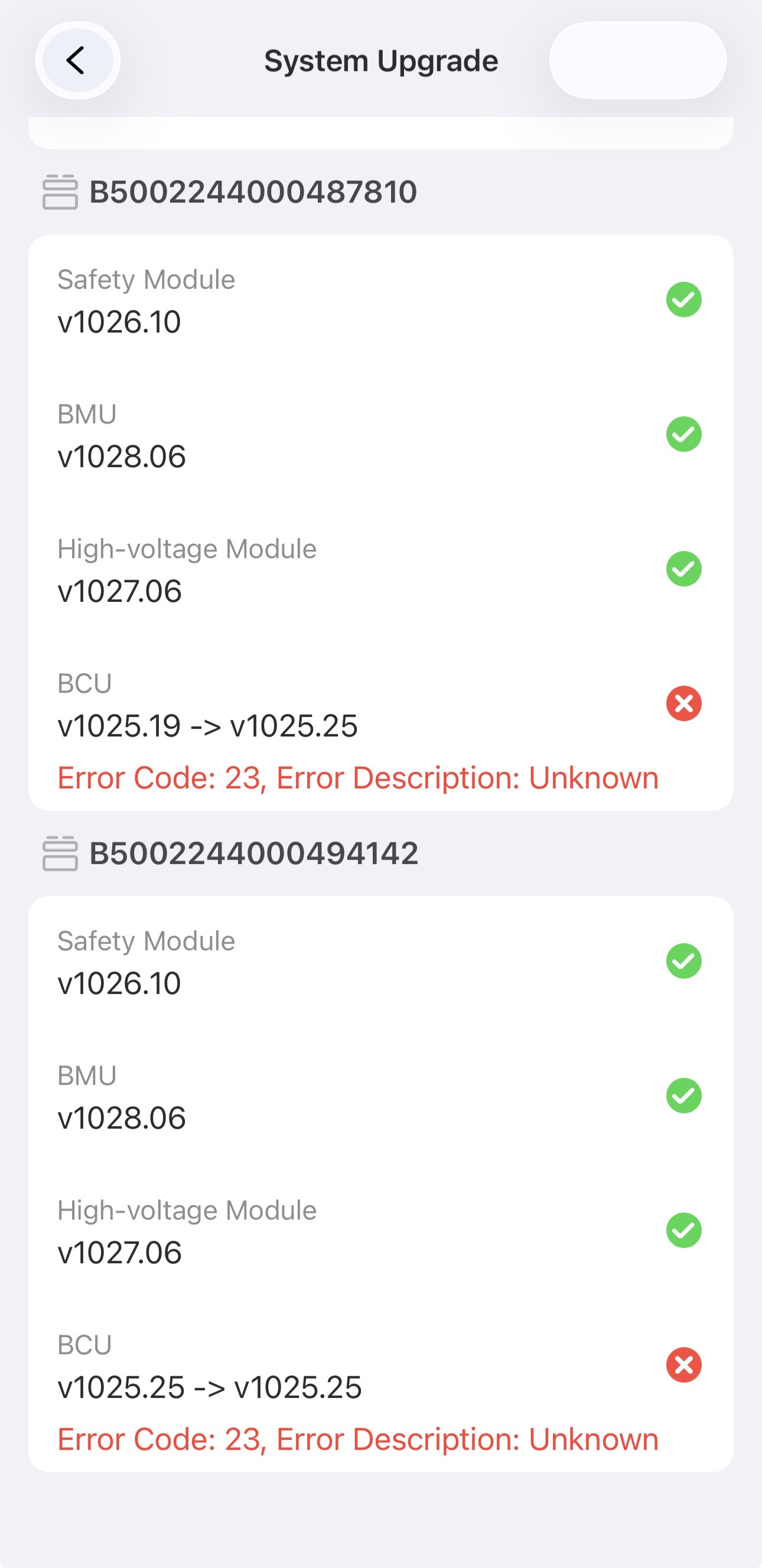 So my system of EP760 and two B500 batteries wouldn’t charge from grid. I’ve been told that I need to make sure my system is 100% up to date with the software updates, and that the latest versions are installed. I was able to install almost all updates using the Bluetti App, except for the BCU part (v1025.10 → v1025.25 doesn’t install over Bluetooth). The progress gets to 33% and fails, returns an error (Error Code 23, Error Description: Unknown).
