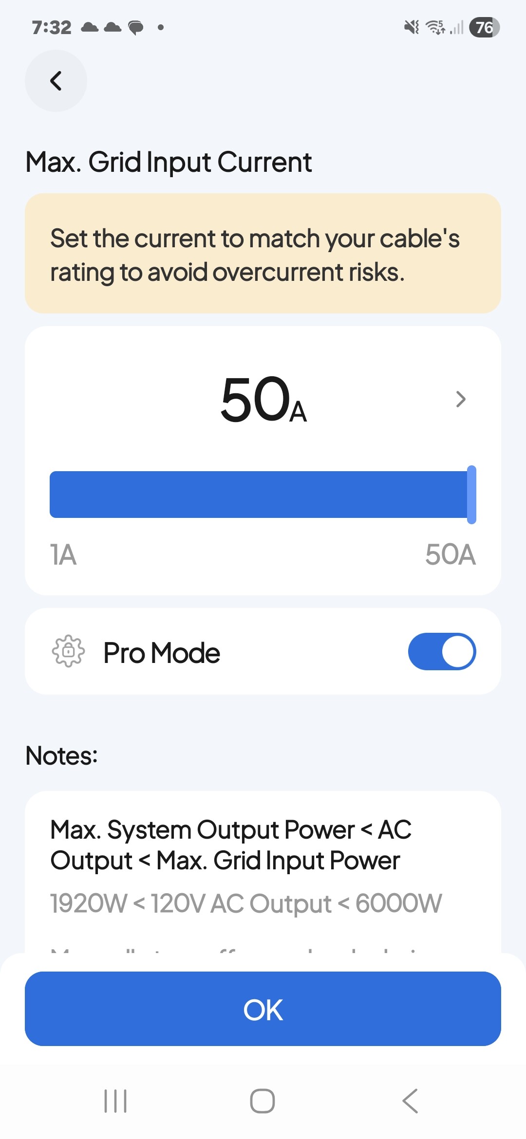 I purchased a Bluetti 50 AMP AC Charging Cable and attached from my generator to my AC500, but only 1.7KW is coming through the cable. Is there a setting that I need to change in the AC500 to get 5KW coming into the AC500? Why won’t 5KW come into the AC500?