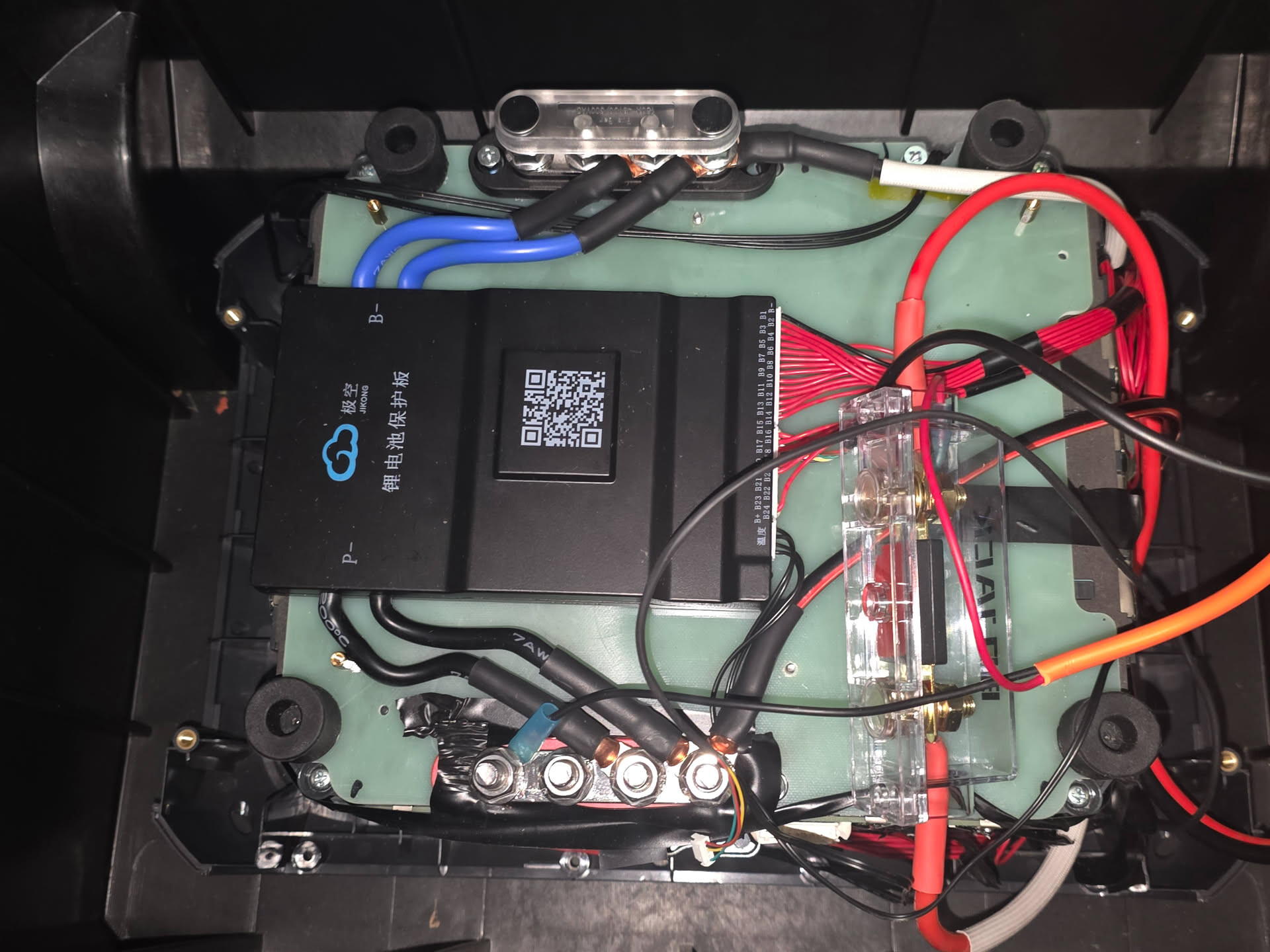 I soldered the 16 leads for each set of cells (B1-B16), one to the common (B0), and one to the positive output cable on the side of the pack. One of the B- leads on the BMS goes to the ground on the side of the battery pack.