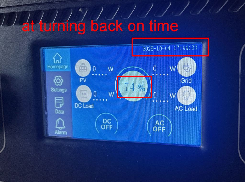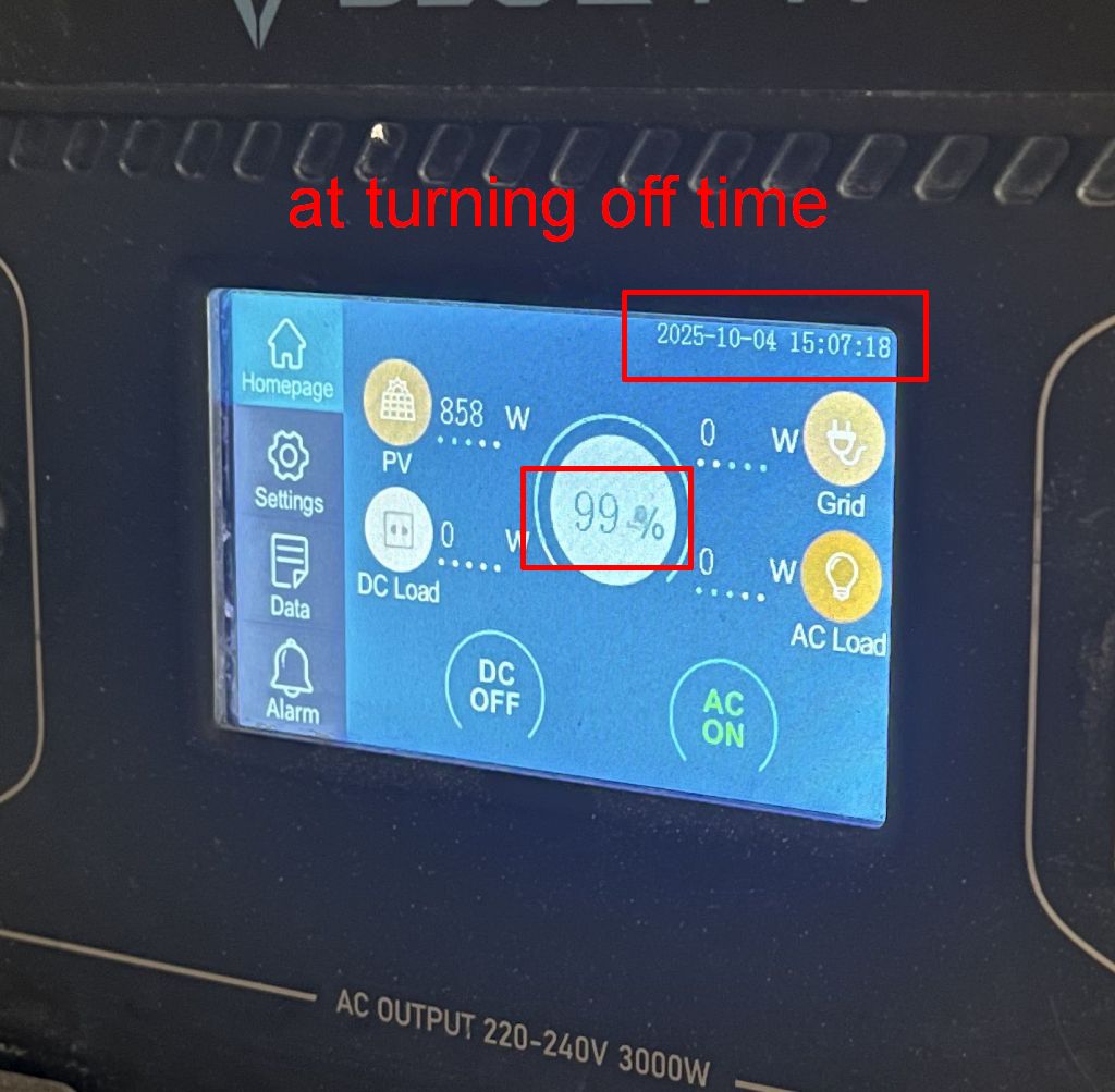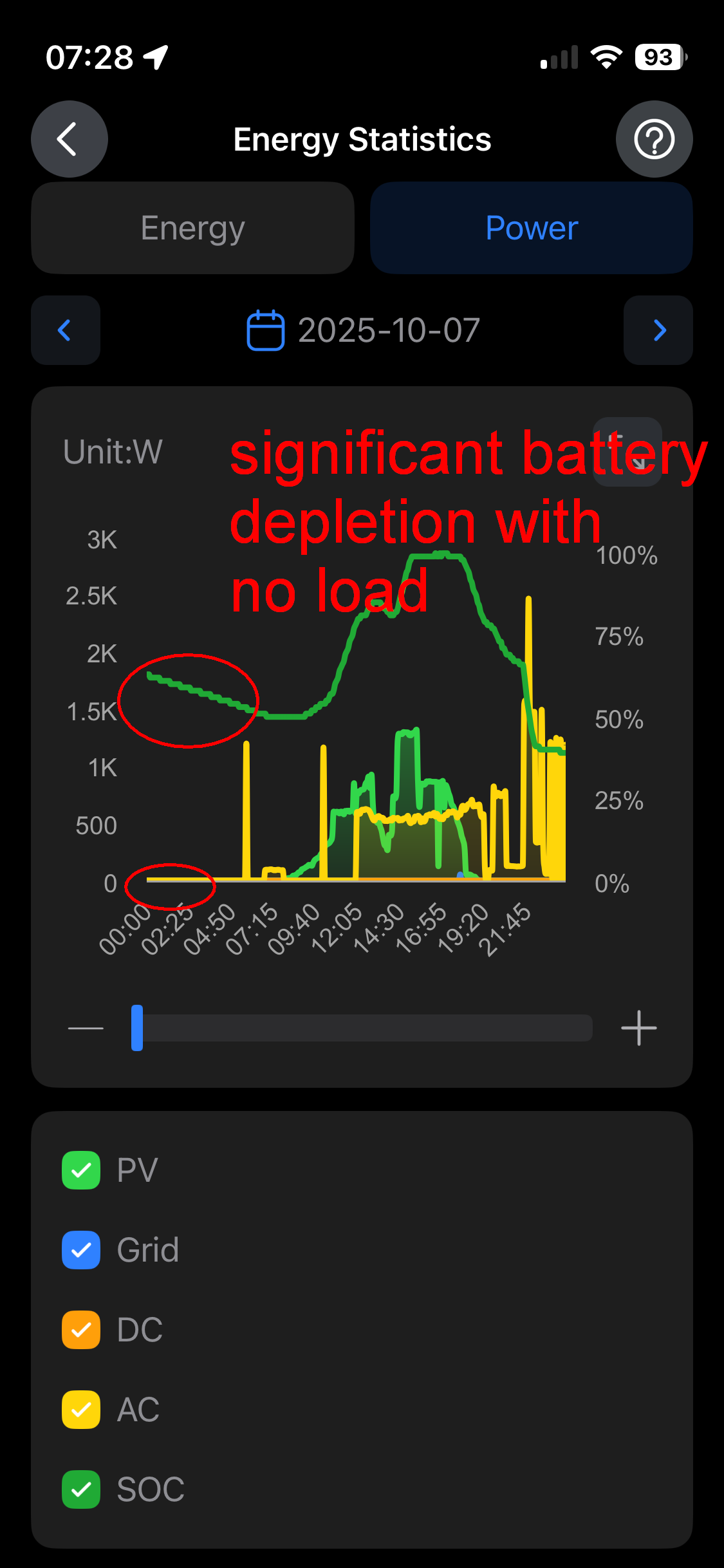 - abnormal battery depletion with no AC/DC load: w/ no AC or DC consumption at all I see charge level drops by 12% in 7 hours