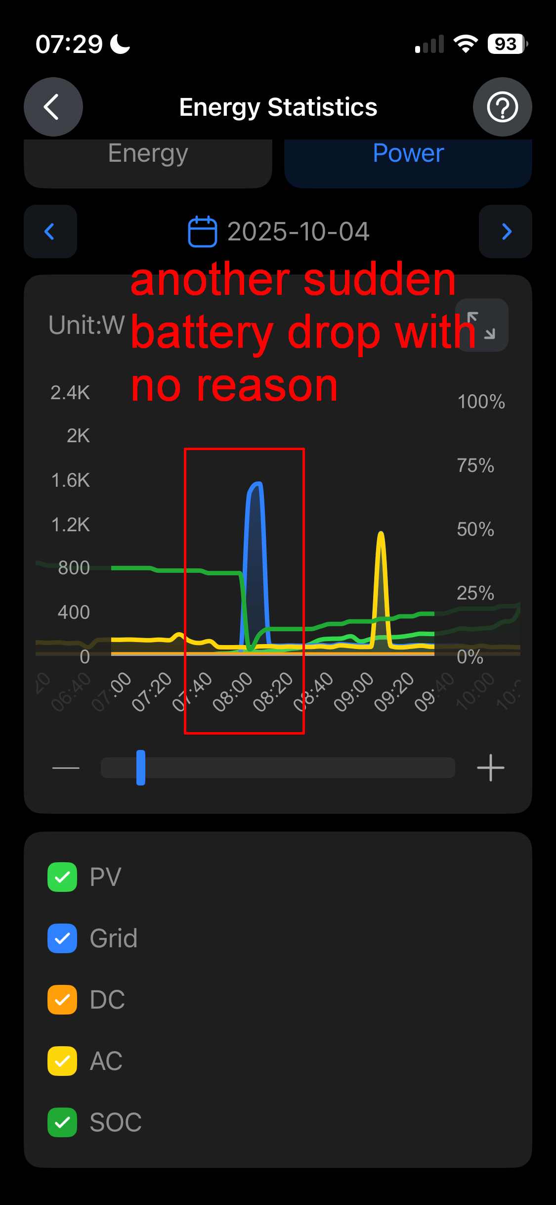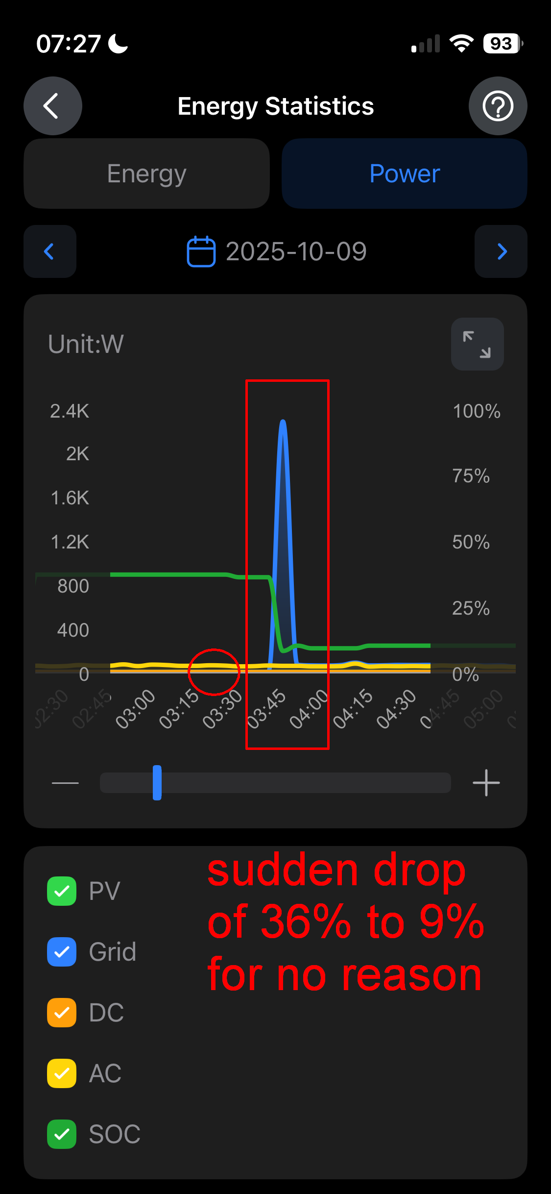 - strange & sudden battery charge level drops: with light AC consumption over time with normal charge level decrease, I start to see sudden drops of battery charge, from 36% down to 9%, triggering grid charge.