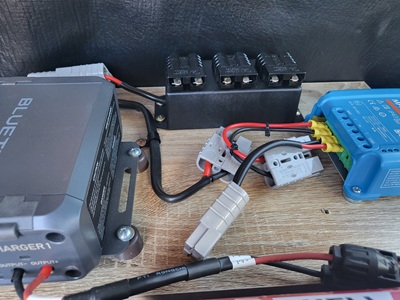 I found the sweet spot for the 20A charger is setting C1 output to 35V. This draws 19-20A from the Aux Bat for a neutral load (charge = load) and gives around 275W charge. However, parasitic load was a concern along with my need to quickly de-install C1 for use in my caravan to top up either power station from a spare 100Ah LFP. Therefore I made it plug and play, but with a Caveat. Pics below