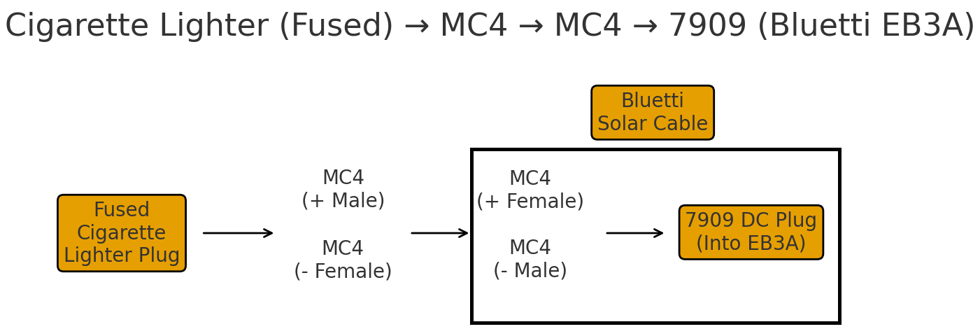 What i am trying to do now is to use cigarette lighter plug to MC4 connection and connect that to MC4 connection of solar panel cable that you guys gave us with the bluetti basically like a diagram below