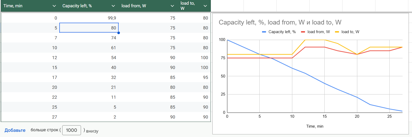 Calculations. With average power of 80-90W from notebook (this Elite 10 showed) the power station with 128 Wh capacity yould work a little more of 1 hour, 128Wh/85W≈1:30:00. Even if substract 20%: 128-20%/85=102.4/85≈1:15:00. But our Elite 10 discharged a twice faster, in 30 mins. Here a discharge observation graph with station’s load: