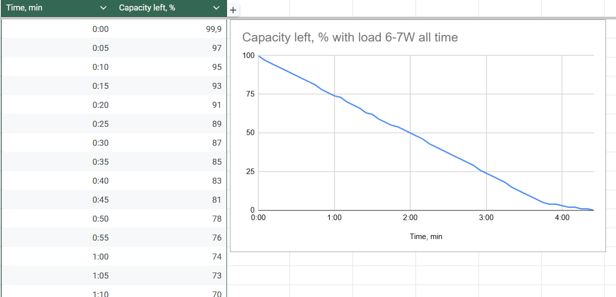 I observed how fast Elite 10 discharges and that’s I got. With average power consumption of 6-7W (as shown on the Elite 10 display during the entire observation period) it discharge in 4:25:00. But I think it should give power a twice long. If simpify calculation, with 6-7W power and 128Wh Elite’s 10 capacity it should work 128/7=18 hours. Even if concidering voltage trasformation from battery voltage to output voltage 12V, for expample 20%, so it still should be more: (128-20%)/7=102.4/7≈14.6 hours. So it look’s like Elite 10 lost a half of capacity.