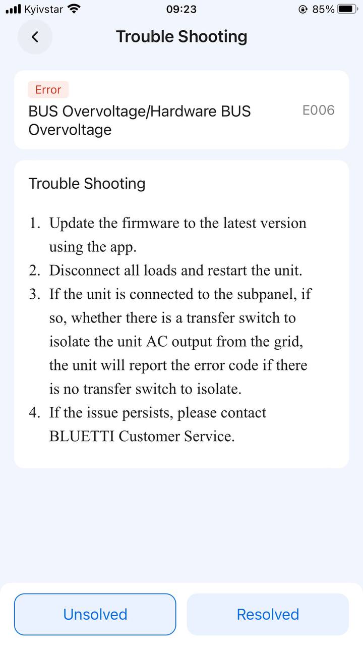 After I recovered the station and updated the firmware I continued to use it as UPS. Another voltage fluctuation occurred on the following days. This time I managed to screenshot the error in the Bluetti iPhone app (screenshot attached below):