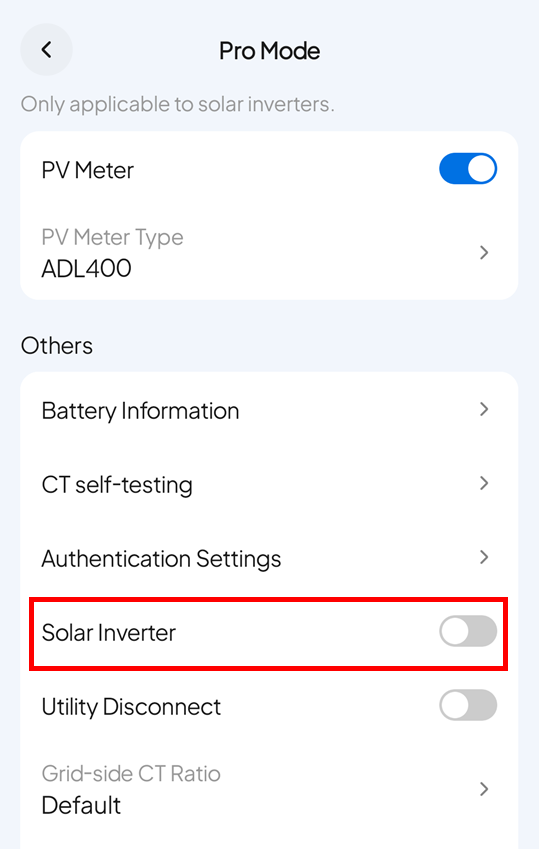 With app V3.05, a new switch called ‘Solar Inverter’ is now visible in PRO mode. What is this switch for, and what does it do?