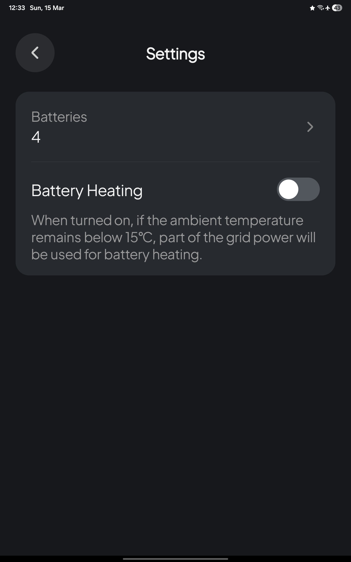 . - Battery Heating is off by default. Winter is approaching in my location and we get minimum between May and Sept around 7 degrees Celsius. I am not sure why installer left this off. If I turn it on, how will I know it is actually working ? Is there any statistics or logging for battery heating feature ? I believe battery cell level info can report cell temp, but as per point 1) above I cannot find cell level info.