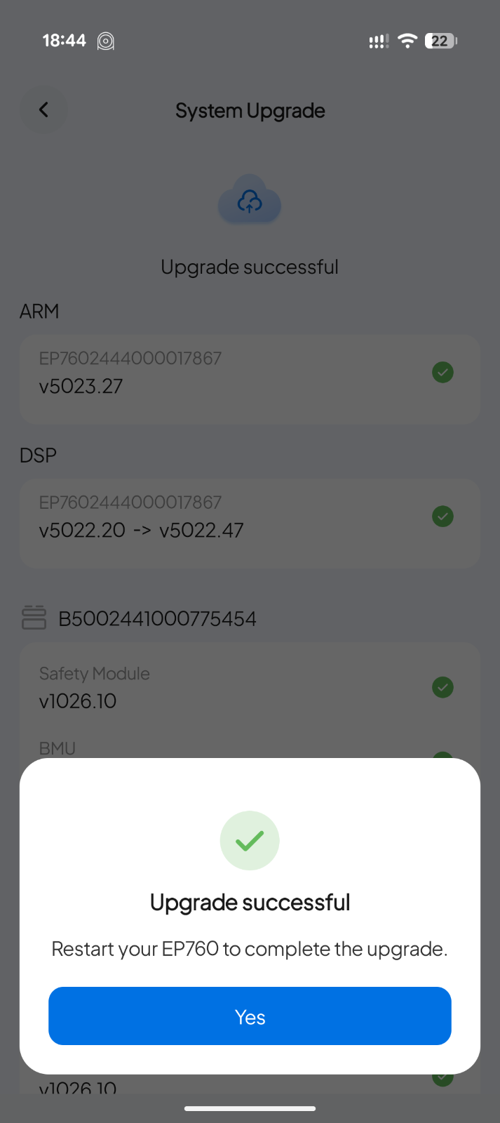 Thanks. Just received a DSP update. Installed it, say “Success, please restart your EP760 to finish it”. Toggle the On/Off switch on the app, same error, and the upgrade is still available.