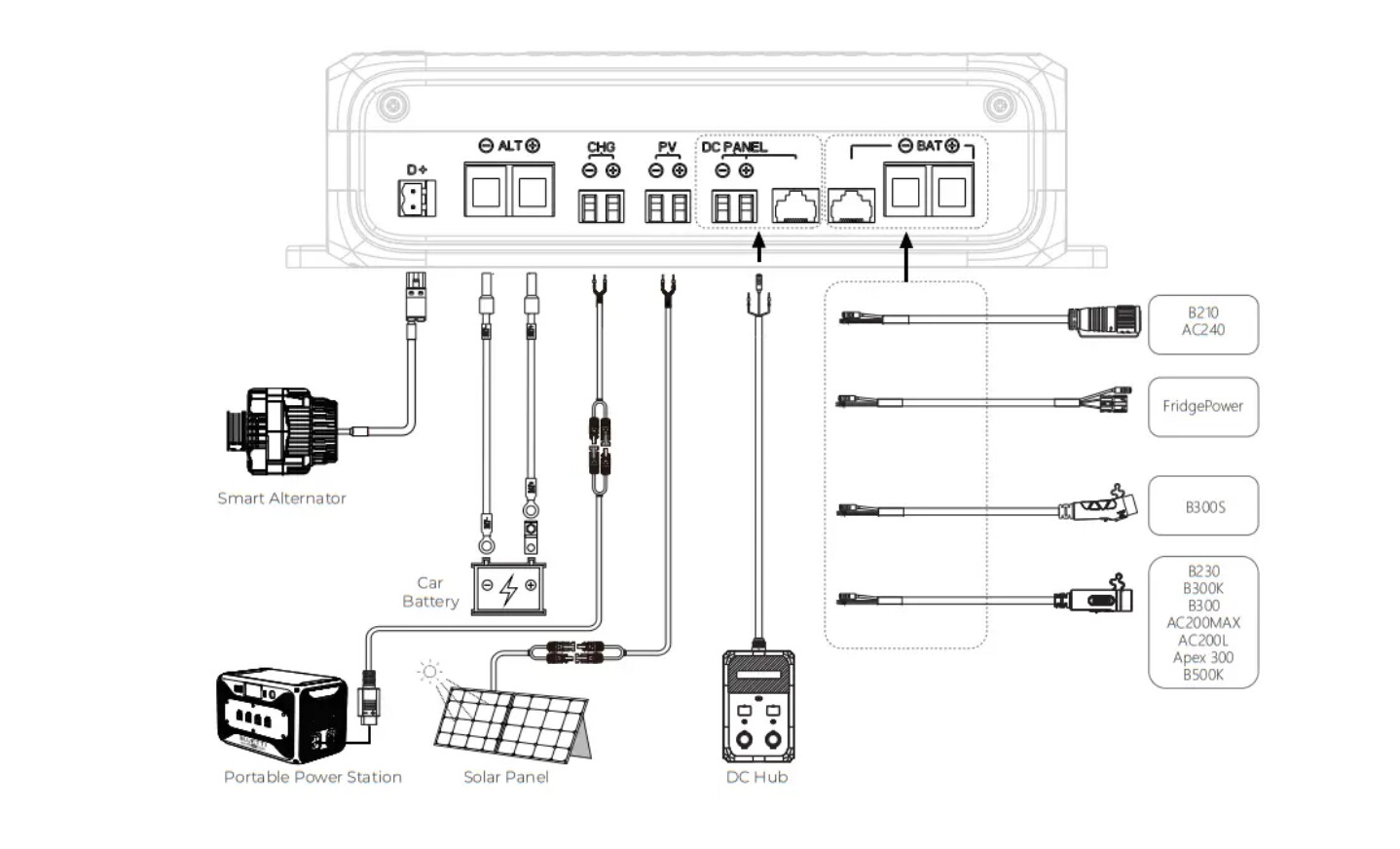 The bat connection should be plugged into your unit via the big round cord, the P090A port, which can push and pull electricity to the charger 2 and then to the DC hub from there.