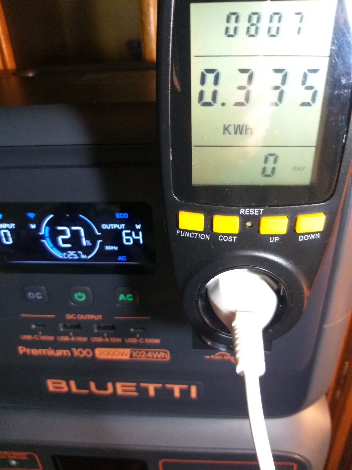 On the first pic (sry for bad quality), I plugged it in, set it to 60 watts, and was really surprised with 90 watts displayed on 100 V2 while my wattmeter had 61 watts on it. However, the time remaining (14.1 hrs) was spot on (1024/(60w +12w inverter drain)). I set the blanket to 40 watts, plugged it in through my watt meter, and left it overnight. It consumed 335 watt-hours in 8 hours (pic 2), but the SOC was at 27% which should be at 50+% (335Wh + (8*12W inverter drain) = 431Wh). Also, 100 V2 displays 40W output as 64W. It has no problem with displaying 20W output, tho.