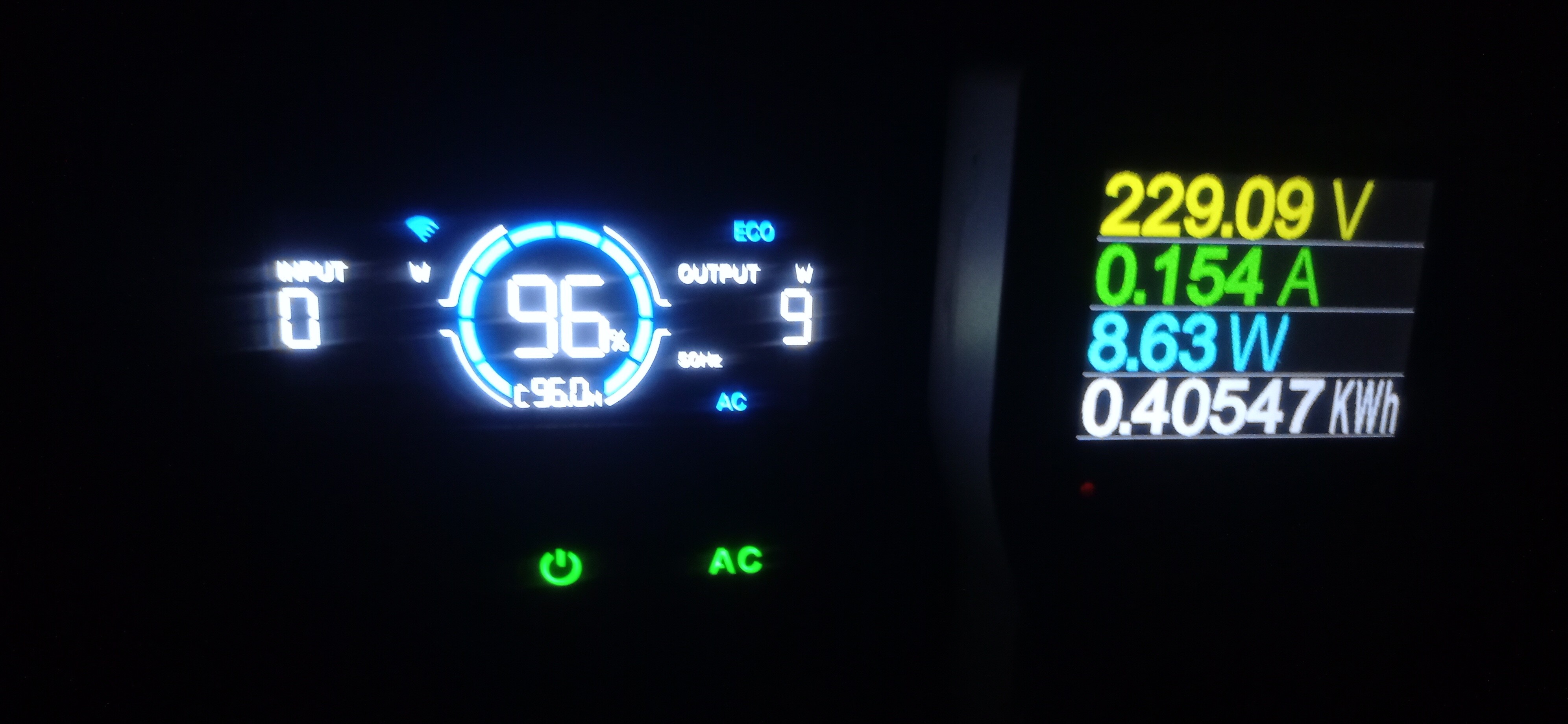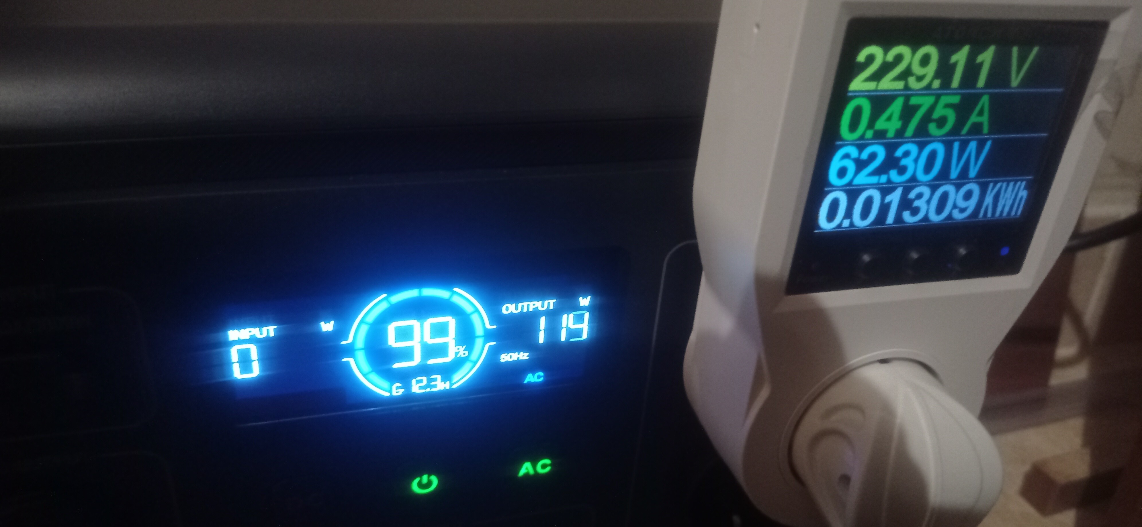Output reading: now, here’s the problem - it’s not quite there yet. I feel like loads under 50W are displayed as active power, but beyond that is still apparent power, because 60W becomes 75W on the display (it was 97W before, tho), and a 130W fridge is ~200W.