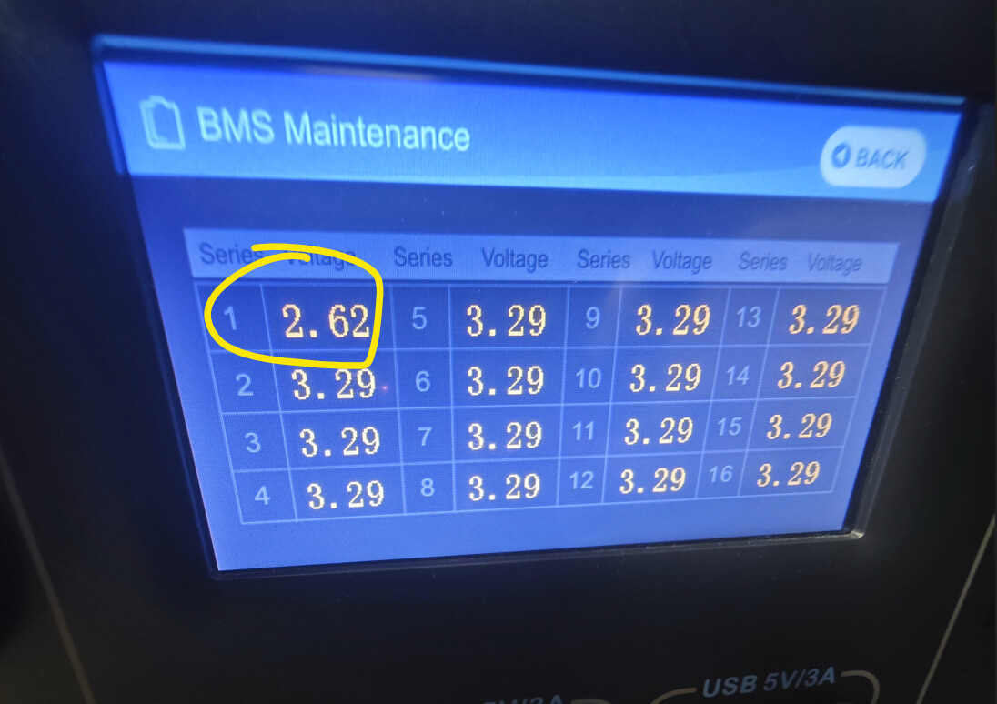 As you can see all cells beside call 1 seem to have plenty of charge left (at least going by their voltage ~70%) while cell 1 made the BMS to shut off the output due to low cell voltage.