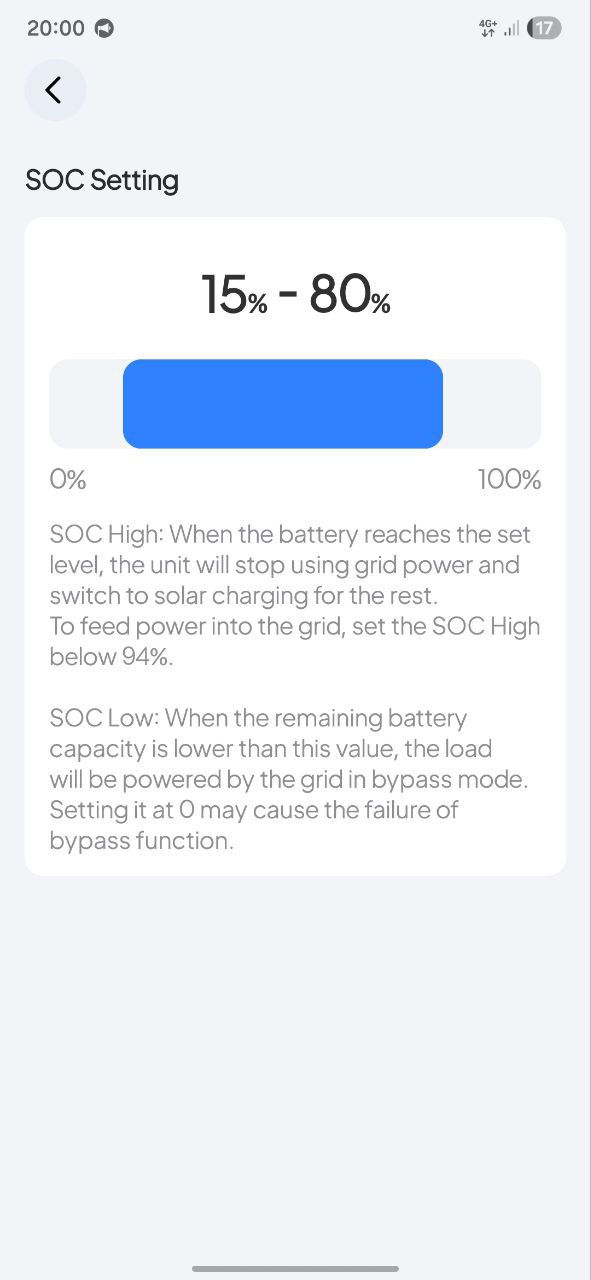 (2) Enable “Feed into grid” and set SOC High under 94% in
