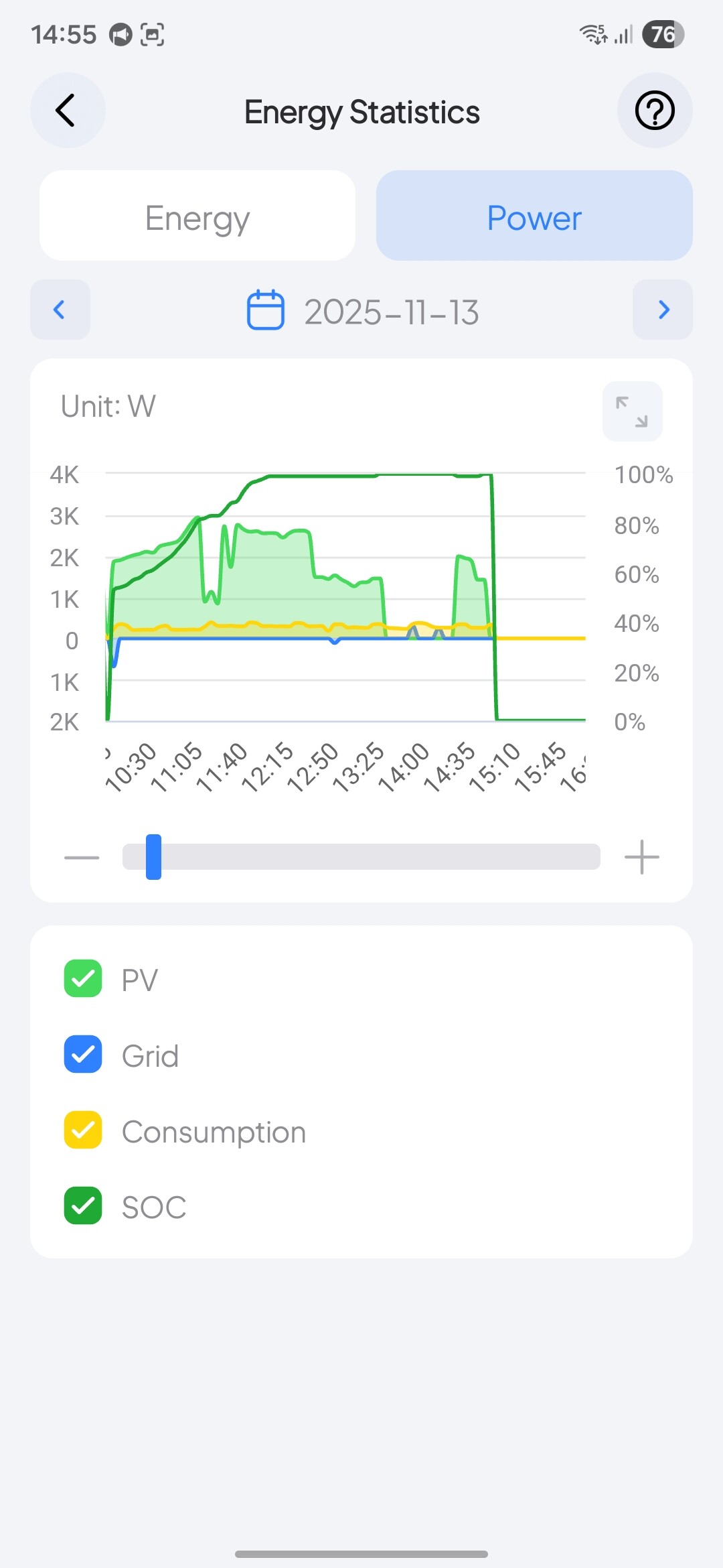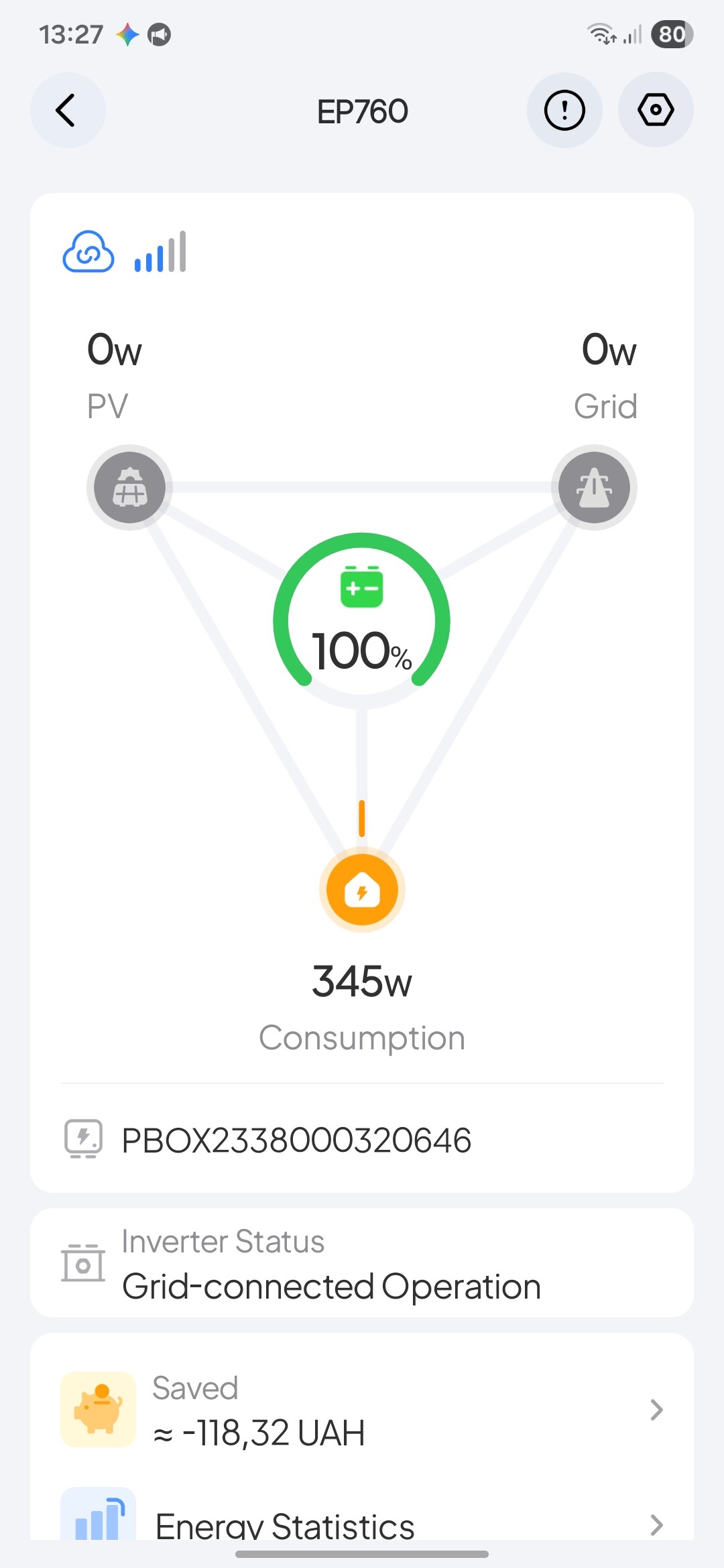 Currently, the solar panels have charged the battery to 100%, and the house’s power has switched to running on the battery.