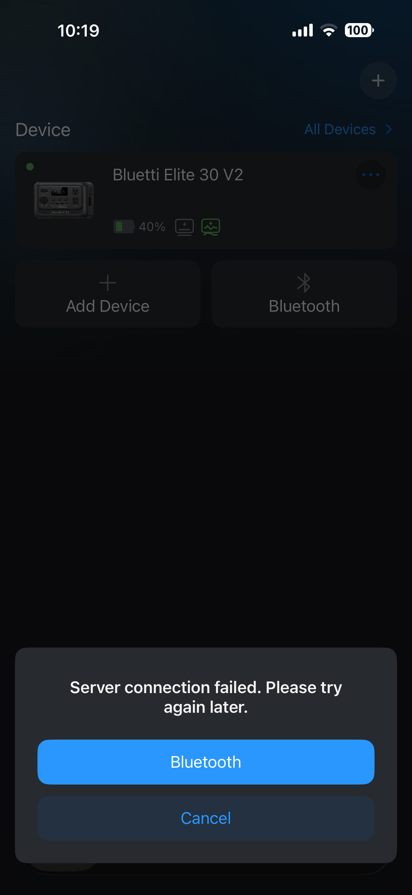 When I open the app, the Bluetti Elite 30 V2 appears (though sometimes I only see a blank screen with the Bluetti logo). However, when I attempt to connect, I receive the message: “Server connection failed. Please try again later.” Afterward, I’m given the option to connect via Bluetooth.