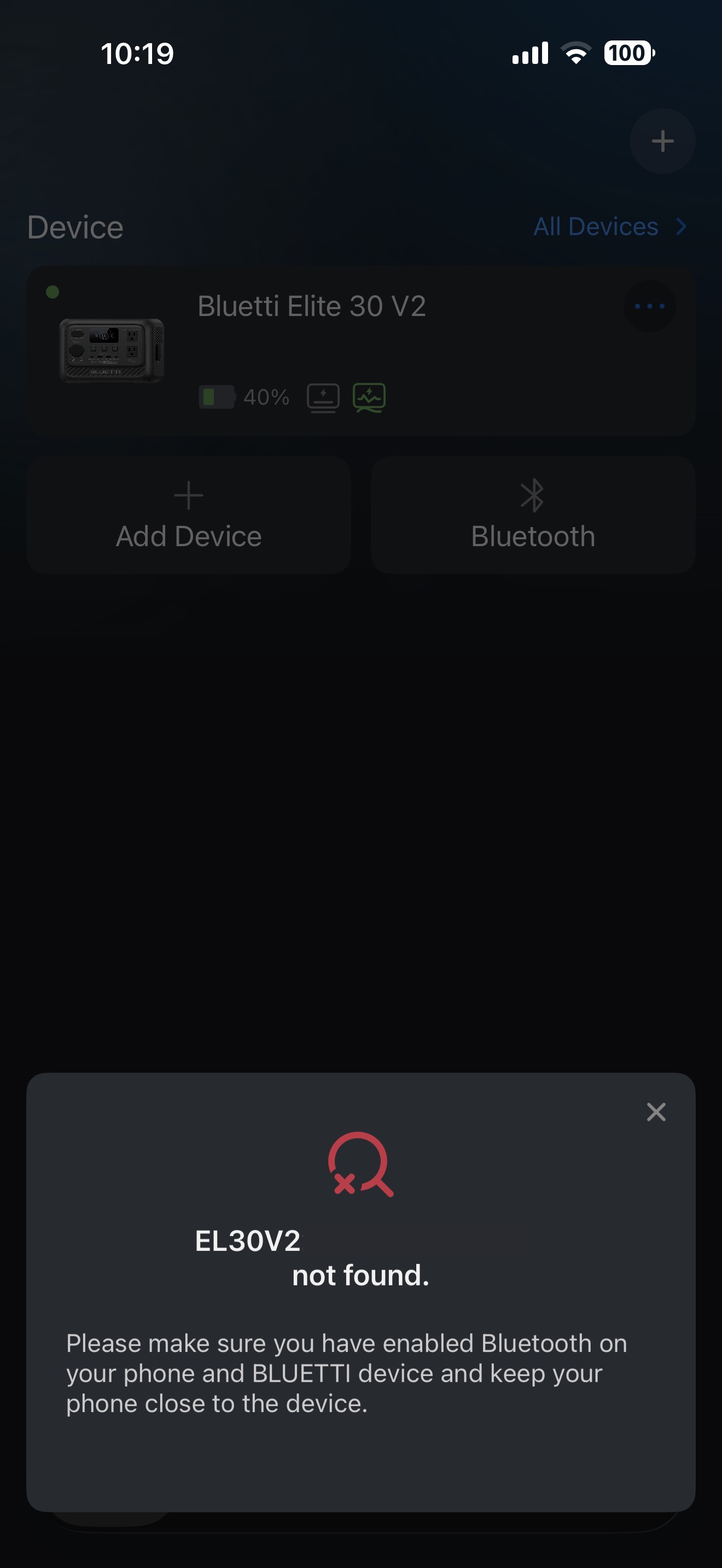 When I try connecting via Bluetooth, I get the following message: “EL30V2SERIALNUM not found. Please ensure Bluetooth is enabled on both your phone and the BLUETTI device, and that your phone is close to the device.”
